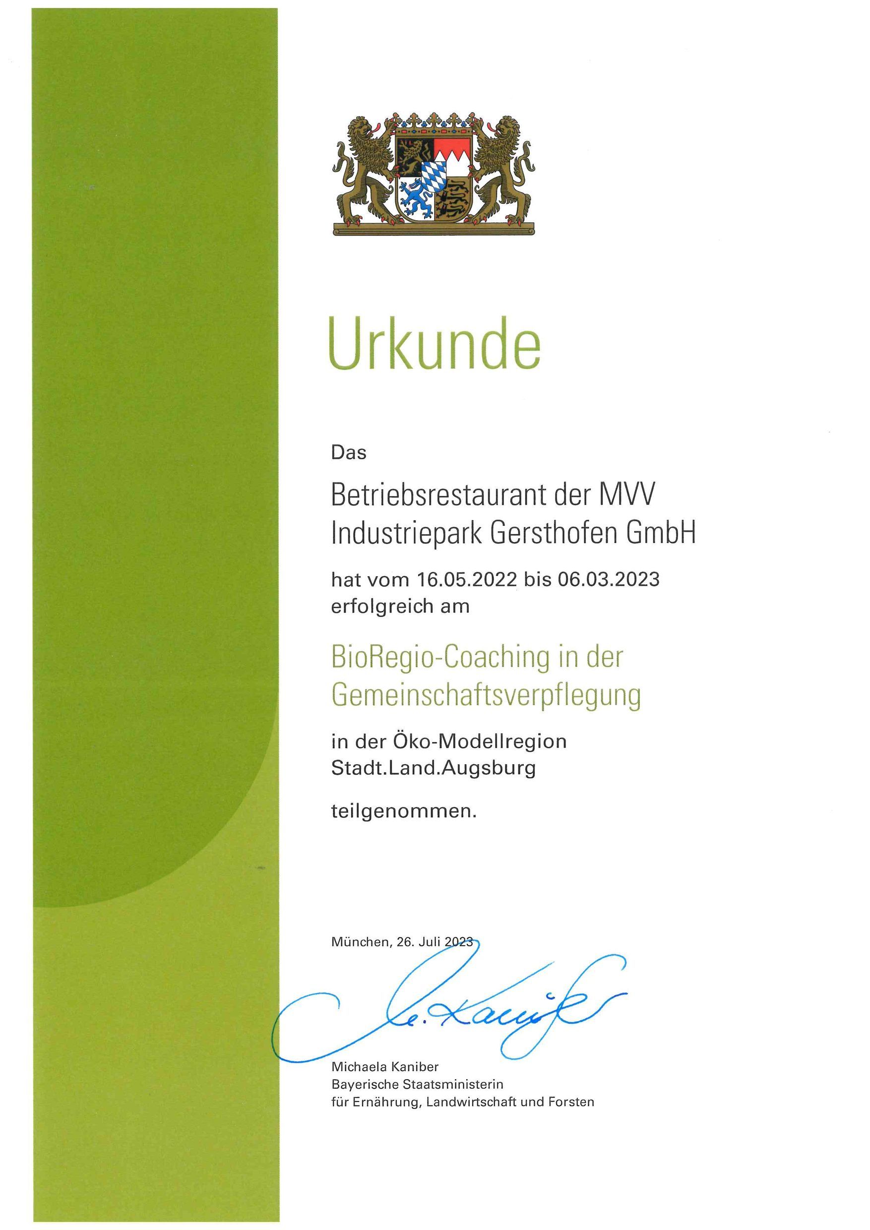 Wir freuen uns, dass der Caterer unsere Schulmensa mit der Urkunde "BioRegio-Coaching" des Bayrischen Staatsministeriums für Ernährung, Landwirtschaft und Forsten ausgezeichnet wurde.